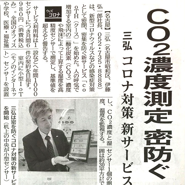 愛知県名古屋に本社を構える計測・測定機器商社、株式会社三弘様(以下、同社)が2020年12月1日より、密回避・換気アラートサービス『cooTH』を開始致しました。cooTHはCO2センサー情報をクラウドに上げ、スマートフォン・PC・サイネージなどに測定した環境データを見える化、更に基準値を超えるとアラートメール・警報音声が流れる仕組みとなっています。クラウド運用サービスを行う事でデータ保存も可能で、測定データをもとに環境対策、分析に活かす事が出来ます。(12月4日 日刊工業新聞)