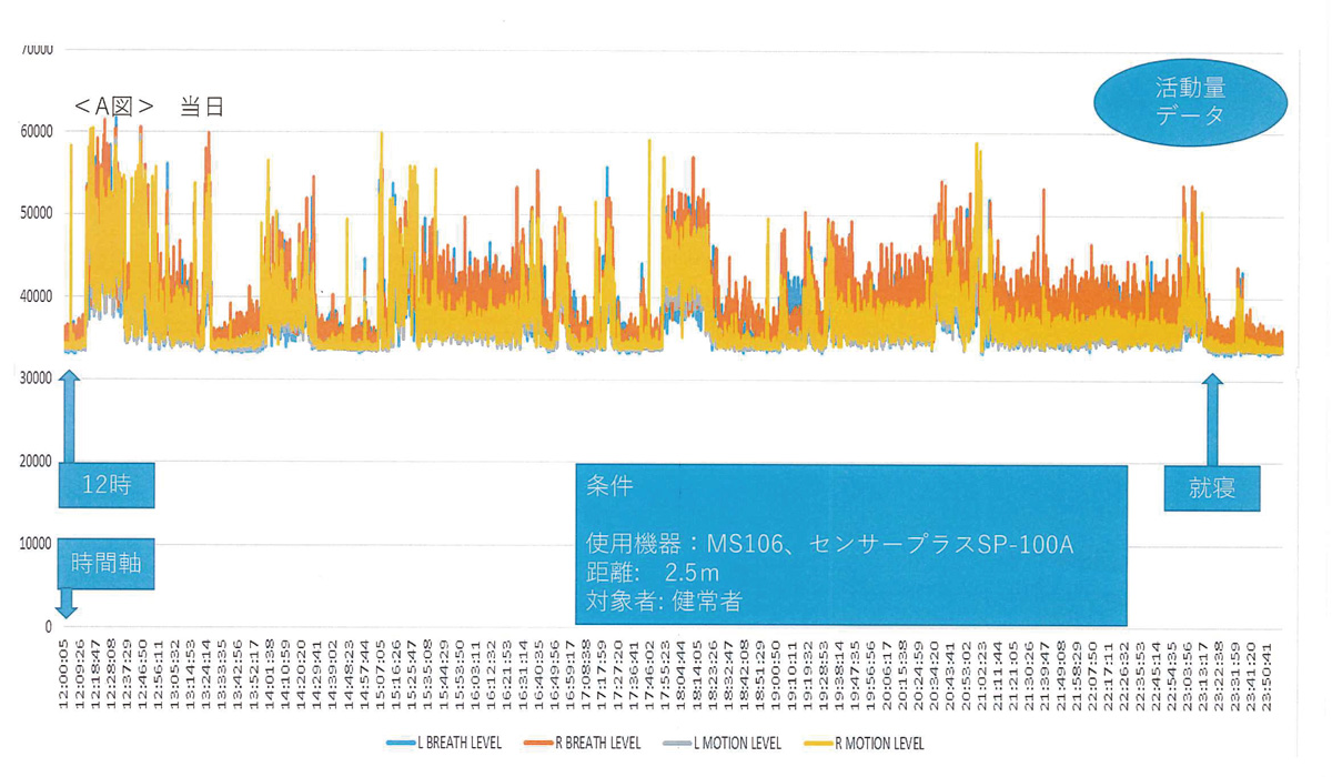 ある介護施設の一人部屋のいる方の呼吸と体動の現在値(=活動量)をCSV出力した毎秒の値で、excelでグラフ化した資料も添付します。ご参考にしてください。