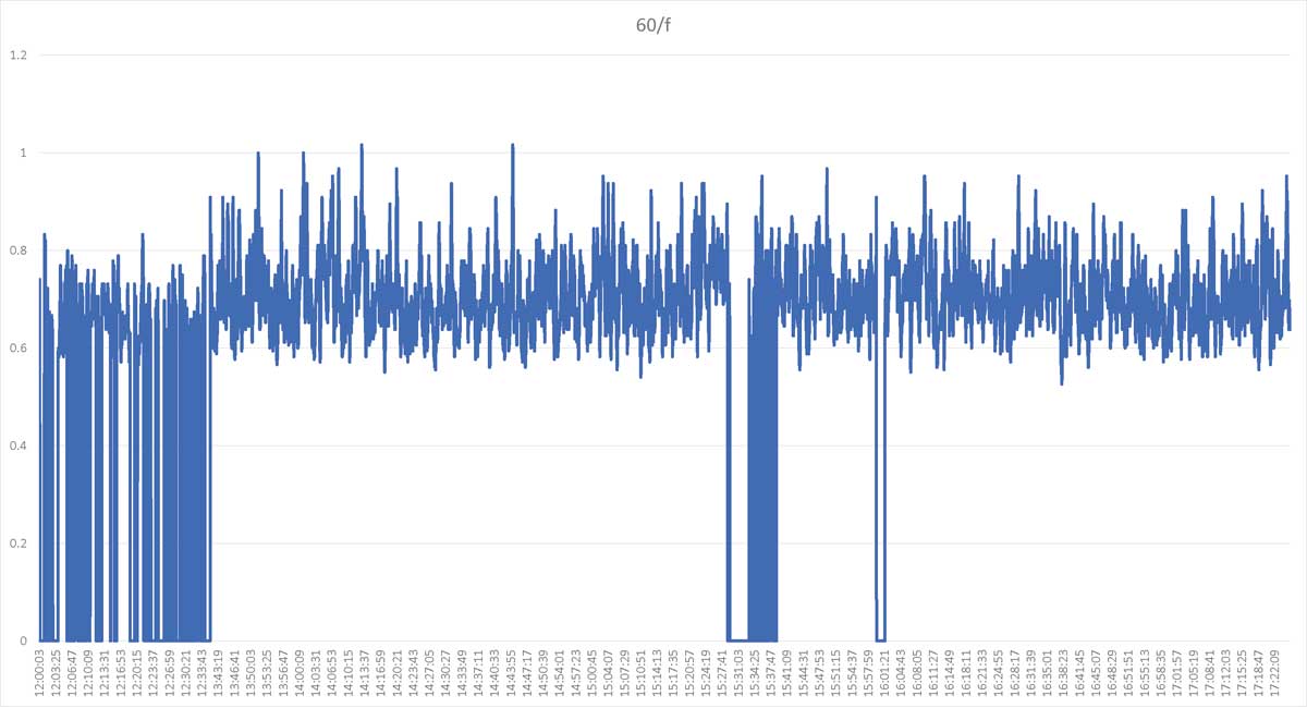 1/f×60として数値1が60bpmで0.6が100bpmとなります(bpmとはbeat per minutes)。私の脈数は大体仕事中は75bpm位ですので数値は0.8となります。仕事中に取ったデータですと大体0.6~0.8の間に収まりますが、車に載って取ったデータですと、場面により0.6~0.8に加えて0.8~1.0が加わったグラフとなります(添付のグラフ)。1.0とは脈数60bpmですので、低いですね。高速道路でぼーっとしてクルージングしていると0.6、興奮してくると0.6~0.8の領域になると言うところでしょうか。